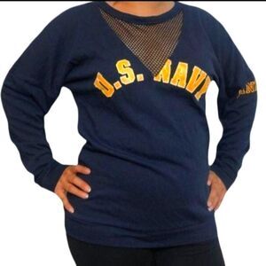 REALLY COOL VS PINK SWEATSHIRT IN NAVY BLUE WITH YELLOW GOLD "U.S. NAVY" SPELLOUT ON FRONT WITH A V NECK CUT AND MESH INSERT, "PINK" SPELLOUT ON UPPER ARM SLEEVE, COZY SOFT FLEECE LIKE MATERIAL ON THE INSIDE, A LITTLE STRETCH...GREAT WITH SOME GYM SHORTS OR A PAIR OF WHITE SHORTS AT THE BEACH IN THE SUMMER!