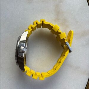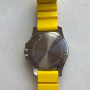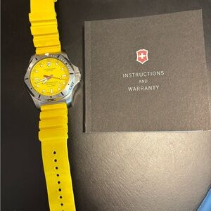 Like New Authentic Victorinox Swiss Army I.N.O.X. Professional Diver Yellow Dial & Strap Men's Sports Watch Model 241735. Yellow Rubber strap. Tang clasp. Uni-Directional Rotating bezel. Dial description: Luminous silver-tone hands on Yellow dial. Battery Operated Quartz movement. Watch functions: Date, Hour, Minute, Second, Military Time, Battery End Of Life Indicator. Screw down crown. Scratch Resistant Sapphire crystal. Case size: 45mm. Solid case back. 200 Meters - 660 Feet water resistant.