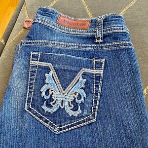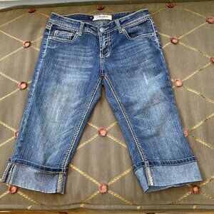 Beautiful denim 00’s shorts Bermuda, midrise, mid to light wash, large cuff, straight leg, distressed, embroidered back pockets