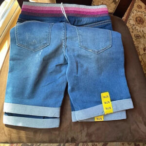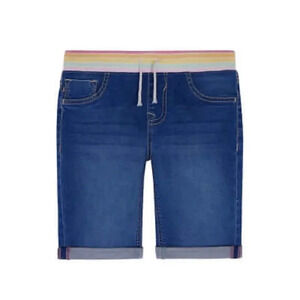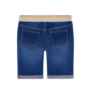 Denim pull on short with colorful waistband and non fucntional drawstrings