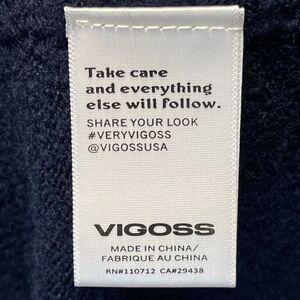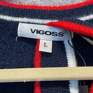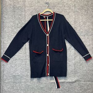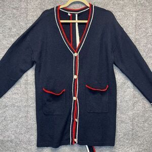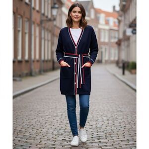 Elevate your layering game with this stylish Vigoss navy longline cardigan in a size Large. This statement piece features luxe pearl and rhinestone buttons, eye-catching red and white striped trim along the neckline, front, and cuffs, and two front patch pockets with red piping. Designed with a flattering open front and a coordinating belt detail for optional cinching, this cardigan combines preppy polish with cozy comfort. Made of a soft stretch blend (74% acrylic, 22% polyester, 4% spandex), it is machine washable and easy to care for.