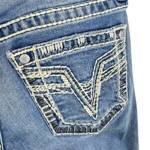 Excellent preowned condition. VIGOSS Slim Boot Medium Wash Low Rise Jeans. Zipper/button closure. 5-pocket design. Cotton/spandex material. Approx. measurements: Waist 26", inseam 30", rise 7". Size 0.