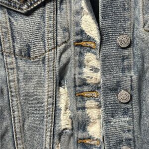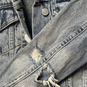 Upgrade your wardrobe with this chic VIGOSS distressed denim jacket in size small. Featuring a stylish vintage wash, heavy distressing on sleeves, front, and collar, this jacket embodies effortless casual style. With classic metal buttons embossed with the VIGOSS logo, it’s perfect for layering over dresses, tees, or sweaters year-round. Ideal for a casual day out, concerts, or festival looks.