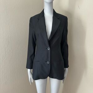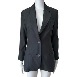 Size 2. Black. STYLE/MODEL V0107-90157 Like new condition. No signs of wear. All pockets are still sewn shut (as new from manufacturer). Nice longer length. Gorgeous lightweight, sumptuous feeling fabric. 62% Bemberg, 38% Cotton. Fully lined in 100% silk brown. Two button front. No back vent. Light shoulder pads. Shown modeled on a size 0 mannequin - fit may differ. Approximate measurements (taken when laying flat - cannot guarantee fit):