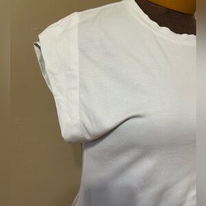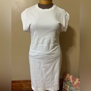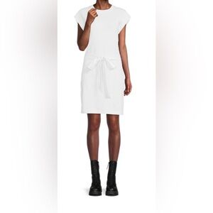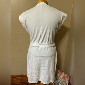 The VINCE Belted Crewneck T-shirt Dress in size small is a versatile and stylish piece perfect for various occasions such as travel, parties, casual outings, and even business meetings. Made from a comfortable blend of spandex and cotton, this knee-length dress features a classic white color, short sleeves, and a crew neck neckline. The belted waist adds a flattering touch, while the pullover closure makes it easy to wear. Perfect for the spring, summer, and fall seasons, this dress combines the style of a classic tee with the sophistication of a dress, making it a wardrobe essential for any fashion-forward woman. SMALL SPOT ON SLEEVE BUT I DID PHOTOGRAPH IT