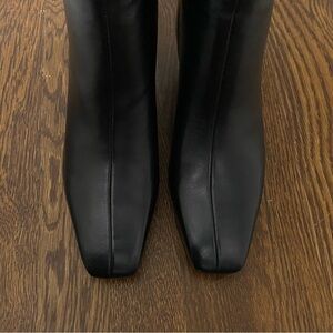 VINCE Beverly Mid Calf Slip-on Wedge Boot with square toe and leather upper. Set on slight wedge heels, these boots are great with jeans or dress.