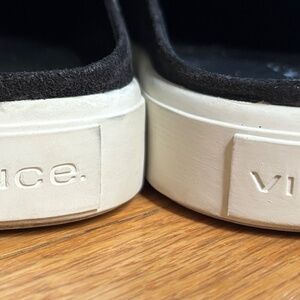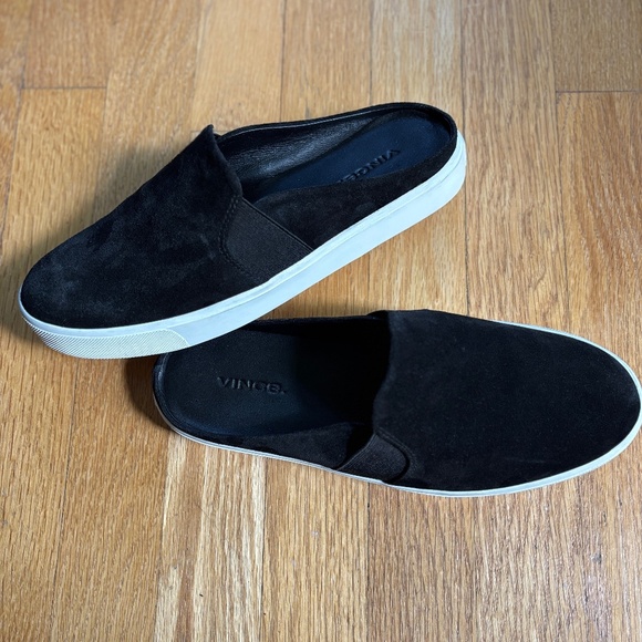 **The Vince Verrell Slide Sneaker is a backless sneaker in Italian sport suede with elastic side gores. FEATURES: Elevated back edge at heel. Padded footbed. Leather lined. 100% Italian suede leather. Rubber sole.