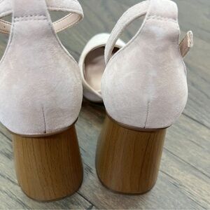 Soft suede in the palest shade of blush pink! Pointed toes; flared block heel (approx 3.5" height), ankle strap has 5 adjustment positions; silver tone hardware; cushioned footbed. NEW! NOTE: box is not included unless requested and may result in additional shipping charges.