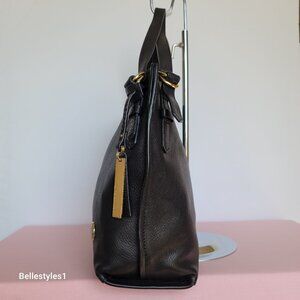 PRE-OWNED, LIGHLY USED, AS PICTURED. TAG ATTACHED. Black color. A large soft slouchy silhouette satchel with roomy interior for your essentials. Designed with several interior pockets for easy organization. Crafted of soft textured pebbled leather with dropped-top-zip closure and hanging logo for added detail.