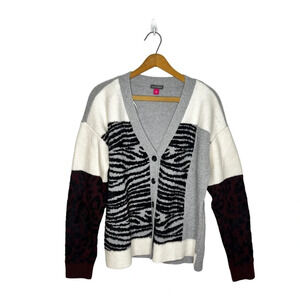 VINCE CAMUTO Color Block Animal Print Cozy V Neck Button Down Cardigan Sweater