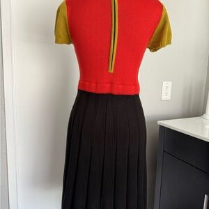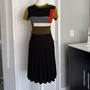Chic knit midi dress with a multicolor block pattern. Features short sleeves and a pleated skirt.