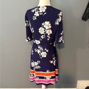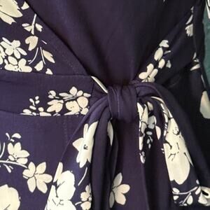 VINCE CAMUTO Dress Size 8 Floral Wrap Navy Blue Short Sleeve V-Neck Stretchy Tie