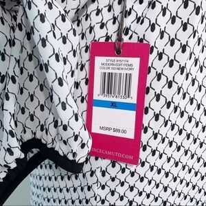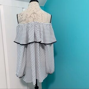 Contrast piping trims the ruffled, off-the-shoulder neckline and cuffs of this breezy crepe top that’s at once classic and totally on trend. Elastic cuffs & top. Runs large; order one size down XL=16-18. Style # 9157174 Color: 103 New Ivory. Rated 5.0 out of 2 ratings on Nordstrom rack. Model pic consists of stock photos, all other pics are actual shirt. 100% Polyester. Machine wash, tumble dry. Measures approximately: 25 1/2” armpit to armpit, 16 1/4” armpit to hem, 13 1/4” armpit to cuff