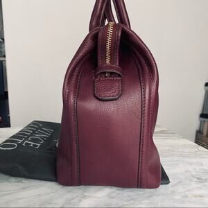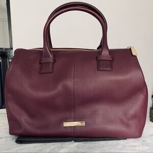 Gorgeous pebbled leather Vince Camuto Jess Satchel handbag in burgundy red. Features front flap pocket with magnetic closure, crossbody strap, two interior slip pockets and one interior zip pocket. Full zipper on top. Gold tone hardware. Comes with storage bag. Measurements are as follows: 15x9x6