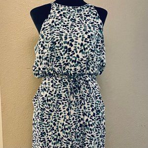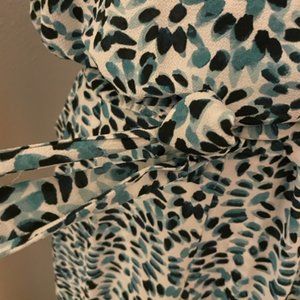 This Vince Camuto Romper has been worn twice. I've had it in my closet for over a year before I cut the tags off two days ago. This romper is classy in a casual envirnonment. It is turquoise and black leopard print. It zips in the back with a button closure on top. It has a tie at the waist to really pull the look together. You can either wear this with black classy sandals or a heel depending on the event or occasion.