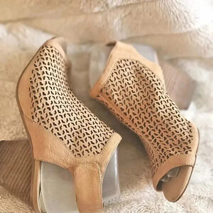 VINCE CAMUTO Leather Laser Cutout Heels Ankle Strap Peep Toe Women Sandals 7.5M