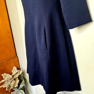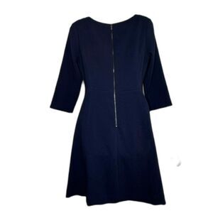 Navy blue fit & flare dress featuring 3/4 sleeves, modest neckline, princess seaming, front seam pockets, lined body, exposed back zipper. Made of 68% polyester, 30% rayon, and 2% spandex. In excellent condition