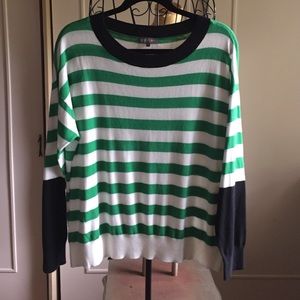 Kelly green and white stripes perfectly matched with black neck band and partial sleeves. It's oversized and comfy to wear, gently used
