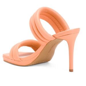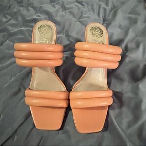 VINCE CAMUTO Puffy Leather Eluinsa Heel Sandals Slip On 4” Melon Peach 8.5 NIB puffy band. 4in. heel, open toe slide on, leather upper, man made sole. Minor signs of store try on. New in Box.