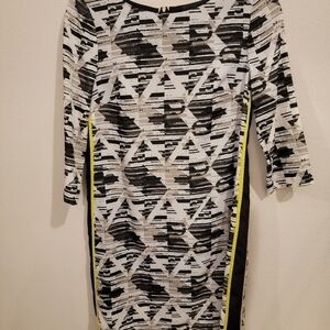 Eye popping neon yellow stripe among the black white and gray pattern on this dress! Fully lined as pictured. Wore once and had it dry cleaned. So many compliments! Can be worn to any occasions. Cool material and 3/4 Sleeves.