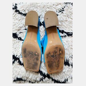 Bright blue, soft fabric top and 1.5 inch heel. Used, Decent condition. Bottoms show wear.