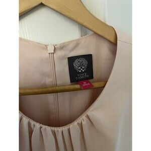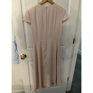 The product is a beautiful Vince Camuto Satin Cap Sleeve Midi Dress in a soft pink (blush) color, designed for women in size 12. The dress features a solid pattern, short cap sleeves, and a zip closure. It is suitable for various occasions such as weddings, parties, casual outings, and formal events. Made of satin fabric, this elegant dress has a midi length and exudes a sophisticated style that is perfect for any special occasion. Weddings, formal events, graduations, corporate.