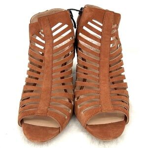 VINCE CAMUTO Size 8.5 Brown/Caramel Peep Toe/Open Heel Ankle Strap Heels.