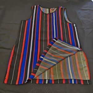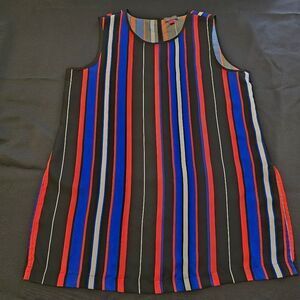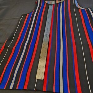 Elevate your wardrobe with this chic sleeveless top featuring bold stripes in black, red, and blue. Perfect for any occasion, this top offers a stylish and modern look.