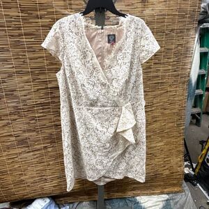 VINCE CAMUTO Womens Beige Embroidered Zippered Scalloped Lace Ruffled Eyelash Cap Sleeve V Neck Size 18W