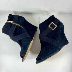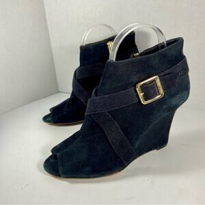 VINCE CAMUTO black suede gold hardware peep toe wedges career date night heels