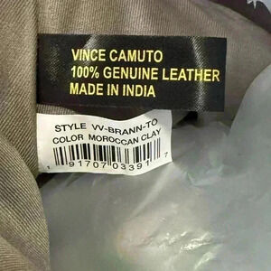 Vince Camuto large shoulder bag tote in Moroccan clay color. Contrast color is dark brown. Zipper, snap and ring detail are gold. Three compartment bag zips in the center and snaps on both side pouches. One side pouch has a zipper pocket inside. The other side pouch has two slide in pockets. Very clean inside. No wear or damage issues that I can find.