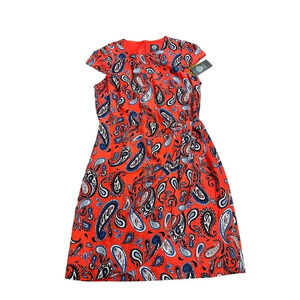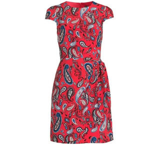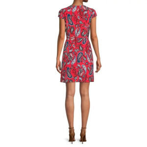 Printed in a colorful paisley pattern, this vibrant sheath dress is designed with a tie waist and cap sleeves.