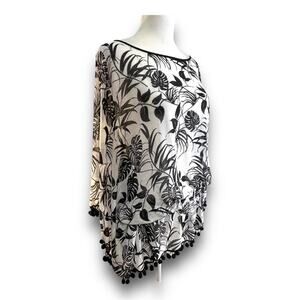 VINCE CAMUTO🎈SOLD black & white tropical flower Caftan with black ball fringe M