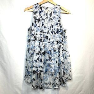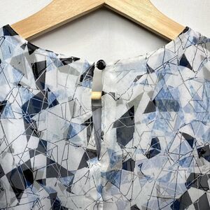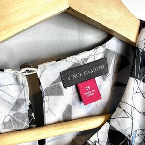 Vince Camuto high scoop neck, sleeveless, keyhole button at back (w/silver Vince Camuto signature button) top. White with black & blue abstract print fabric with a lovely draped flow to the fabric. Pair with a leather jacket, jeans and boots for a great day to evening outfit! Size XS, excellent condition no flaws.