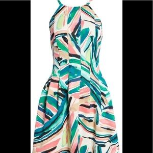 Vince Camuto sleeveless dress. Fit and flare. vibrant print frock styled with cutaway shoulders and flared skirt. Lined. Size 6. NWT.