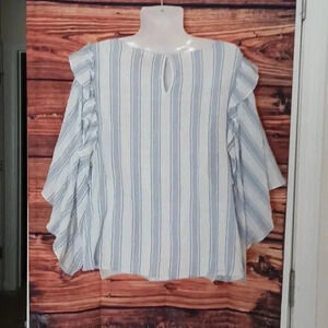 like new. vertical, blue, and white stripes. soft material. wide and flowing sleeves