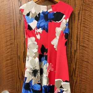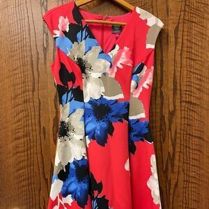 Like new Vince Camuto pink floral v neck fit and flare midi dress. EUC, great shape, size 6, polyester spandex blend for stretch and shape, skater style, back zipper, see pictures for details.