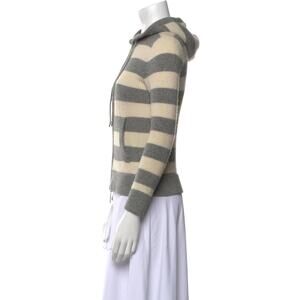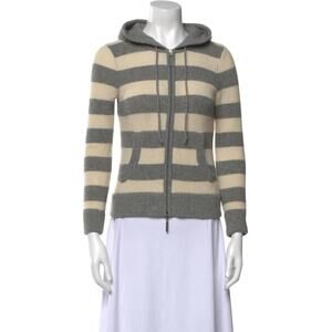 VINCE Cashmere Striped Hooded Full Zip Sweater - M Grey/Cream