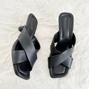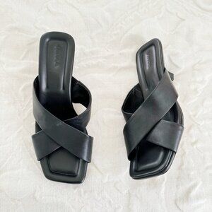 Smooth crisscross straps arch over a chic square toe on a modern sandal cushioned with plush foam.