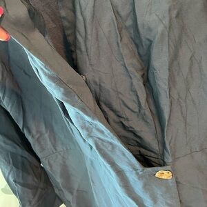Wrap silhouette with hammered button and hidden snap closures at waist