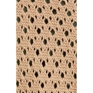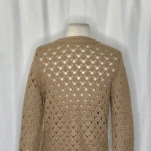 V neckline ~ Long sleeves ~ Straight hemline ~ Three button closures on the front … no true button-hole openings … I just worked the buttons through the crochet knit ~ Cropped silhouette ~ Open weave crochet style knit fabric ~ Fabric is a soft wool & cashmere knit blend ~ Solid light brown or tan … color is called “Amber Light”