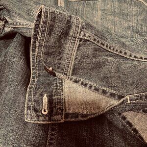 The VINCE Women's Distressed Denim Jacket in size Large is a stylish and versatile piece perfect for various occasions. Featuring a button closure and long sleeves, this jacket is made from 100% cotton denim in a classic blue color. With a short length and regular fit, it is ideal for layering in all seasons. The jacket's western, festival, and biker themes add a trendy touch to any outfit, making it a must-have for fashion-forward women looking for a raw hem, classic denim style. I'm not 100% sure of the wash color since it is missing. But it is a medium navy wash.