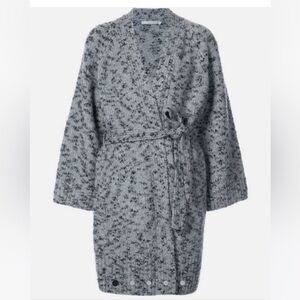 No closure - V-neck - Bracelet-length sleeves - Removable tie belt - Front slant pockets - 82% wool, 9% cashmere, 9% polyamide. Hand wash, dry flat.