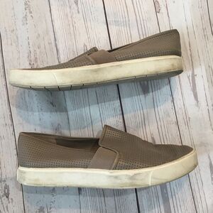 These Vince sneakers are in good used condition. Gray Perforated Leather upper. Some evidence of wear (pictured) including discoloration around the soles and some mild gapping between the material and the sole. Size 8.