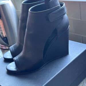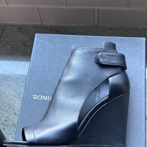 Vince wedge shoes with elegant cutouts and peep toe for a year round look. Adjustable hook and loop strap. Made in Italy. Size 8.