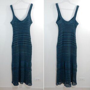 Keywords: Vince, crochet dress, midi dress, knit dress, sleeveless dress, teal green dress, casual dress, summer dress, vacation dress, boho dress, beach dress, designer dress, L dress, Vince dress