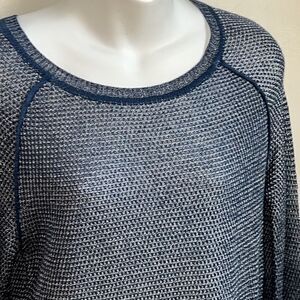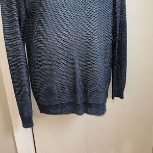 Rayon and linen blend mesh knit sweater in a navy and silver marled pattern, crew neck, ribbed cuffs, collar and hem. Dry clean. Care tag has been removed. Excellent condition. Size small oversize fit so could fit larger sizes. Measures 19” from armpit to armpit and 24” from top of shoulder to bottom hem.