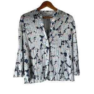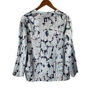 VINCE Pleated Tide Pool Lotus Print Button Down Blouse. Fine accordion pleats create the easy fit of this lightweight blouse covered with an ethereal lotus pattern. Band collar Split neck Three-quarter sleeves.