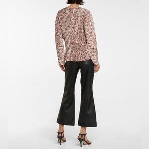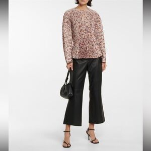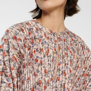 Vince's blouse is cut from satin with a soft luster. It's printed with a cornucopia of pomegranate shoots and fastens with an elegant faux pearl at the front keyhole. The accordion-pleated hem ripples beautifully as you move.