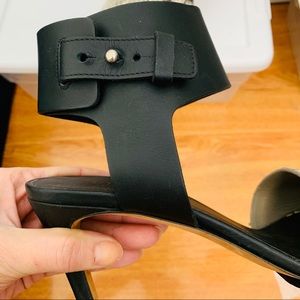 Thick python embossed leather vamp and black leather wrap ankle with covered heel. Wearable heel height. Made in Italy. Worn just 2-3 times. Right heel has a scuff/scratch to covered heel, pictured.
